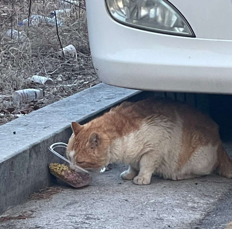 배고픔에 이끌려 천천히 다가와 허겁지겁 먹었다.